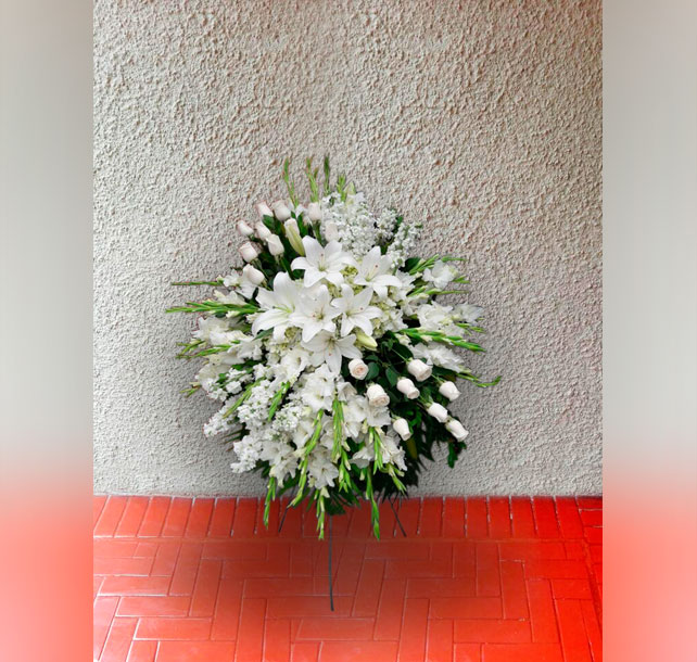 Arreglo mediano de rosas, gladiolos, liliums entre otras flores según estación acompañadas de fino follaje, todo sobre un parante de metal. El color puede variar de acuerdo a la disponibilidad de nuestro stock. Altura aproximada 1.30 mt