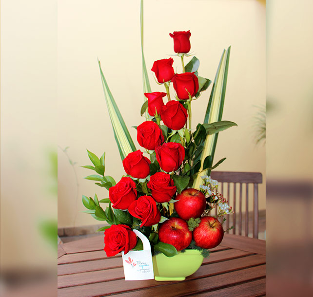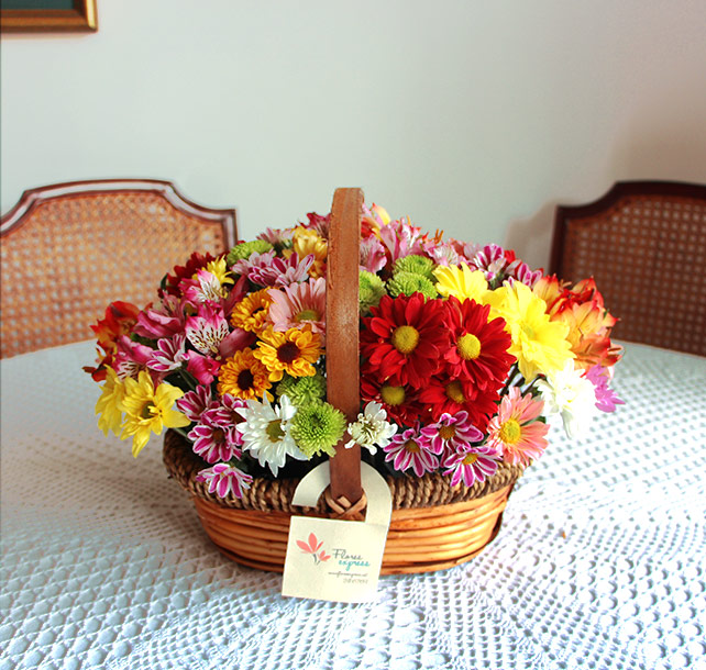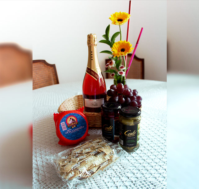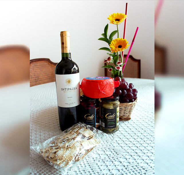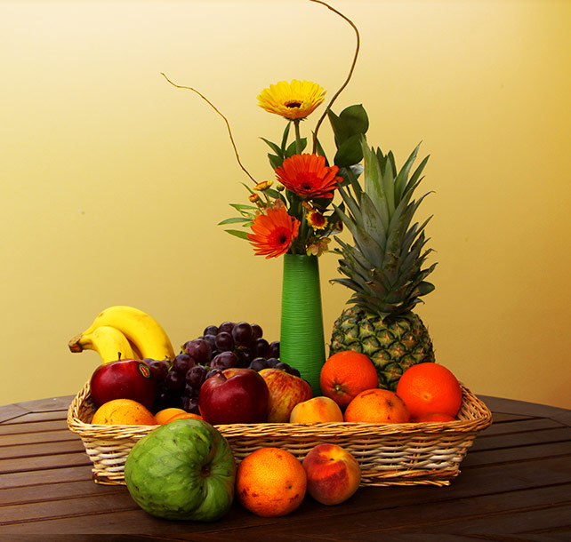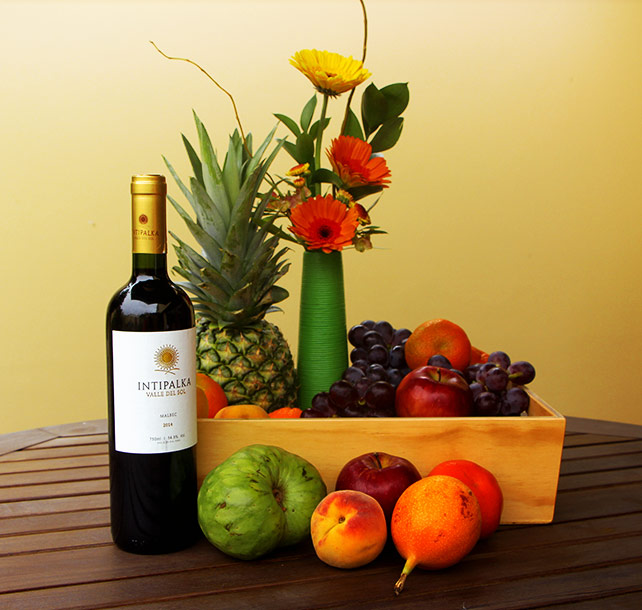 CANASTA DE FRUTAS, FLORES Y VINO TINTO