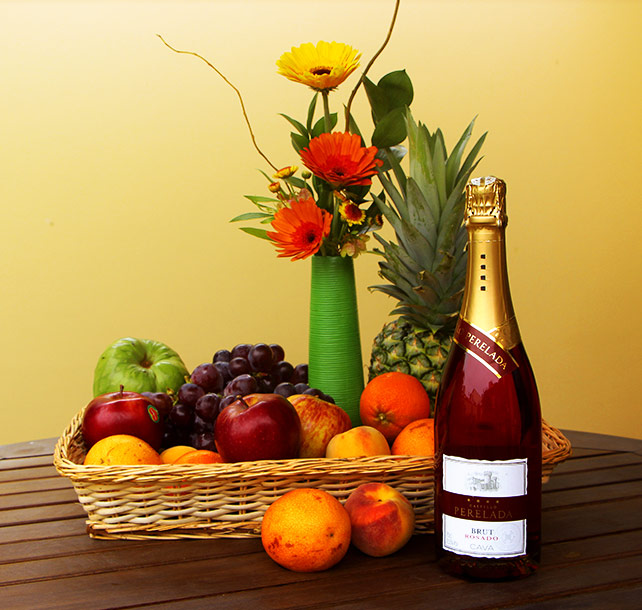 CANASTA DE FRUTAS, FLORES Y CAVA