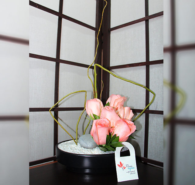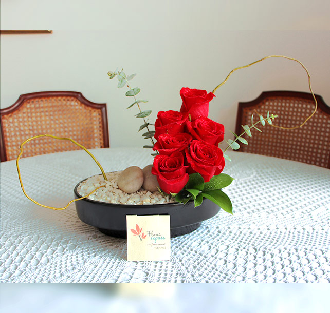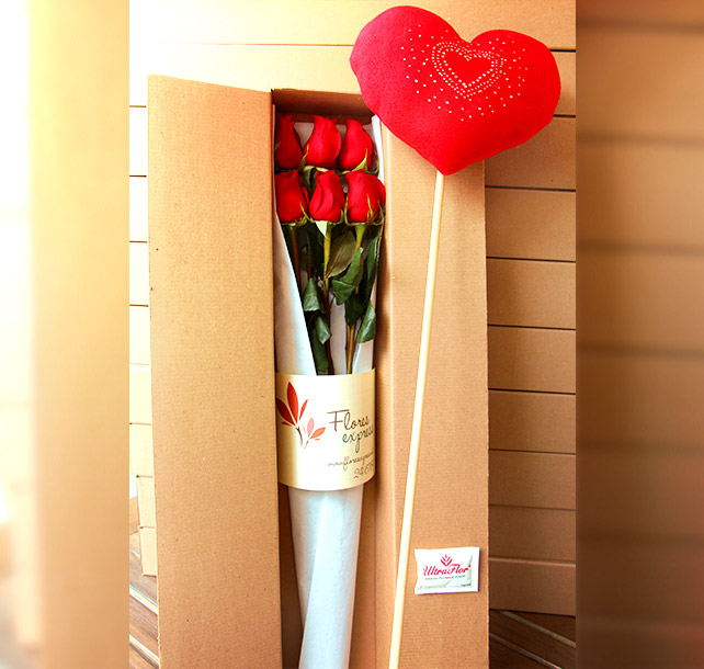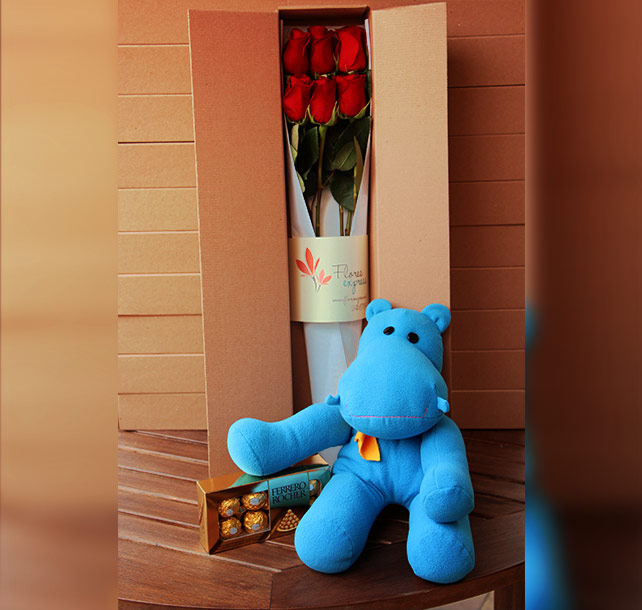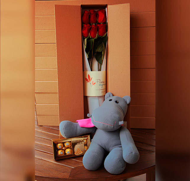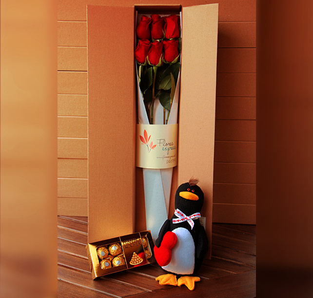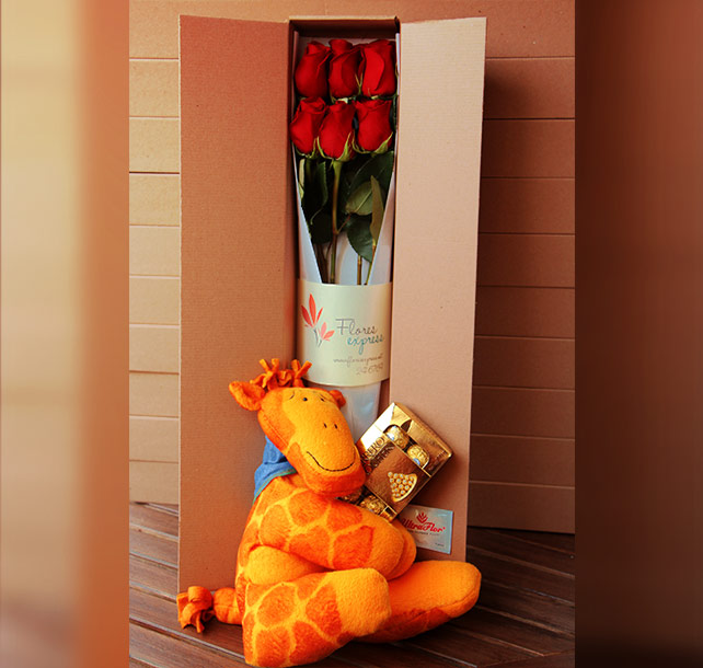CAJA DE 6 ROSAS + BOMBONES FERRERO ROCHER + PINKI
