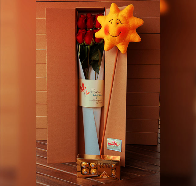 CAJA DE 6 ROSAS + BOMBONES FERRERO ROCHER + SOL