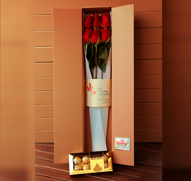 CAJA DE 6 ROSAS + BOMBONES FERRERO ROCHER